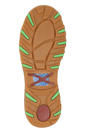 Full-grain leather upper with side panel embroidery, breathable moisture-wicking Air-Mesh lining, removable moisture-wicking antibacterial and machine washable moulded footbed, compression-moulded EVA midsole integrated with Twisted X patented CellStretch comfort technology, nylon/glass fibre shank provides long-lasting comfort stability and durability, moulded rubber outsole provides durability.
