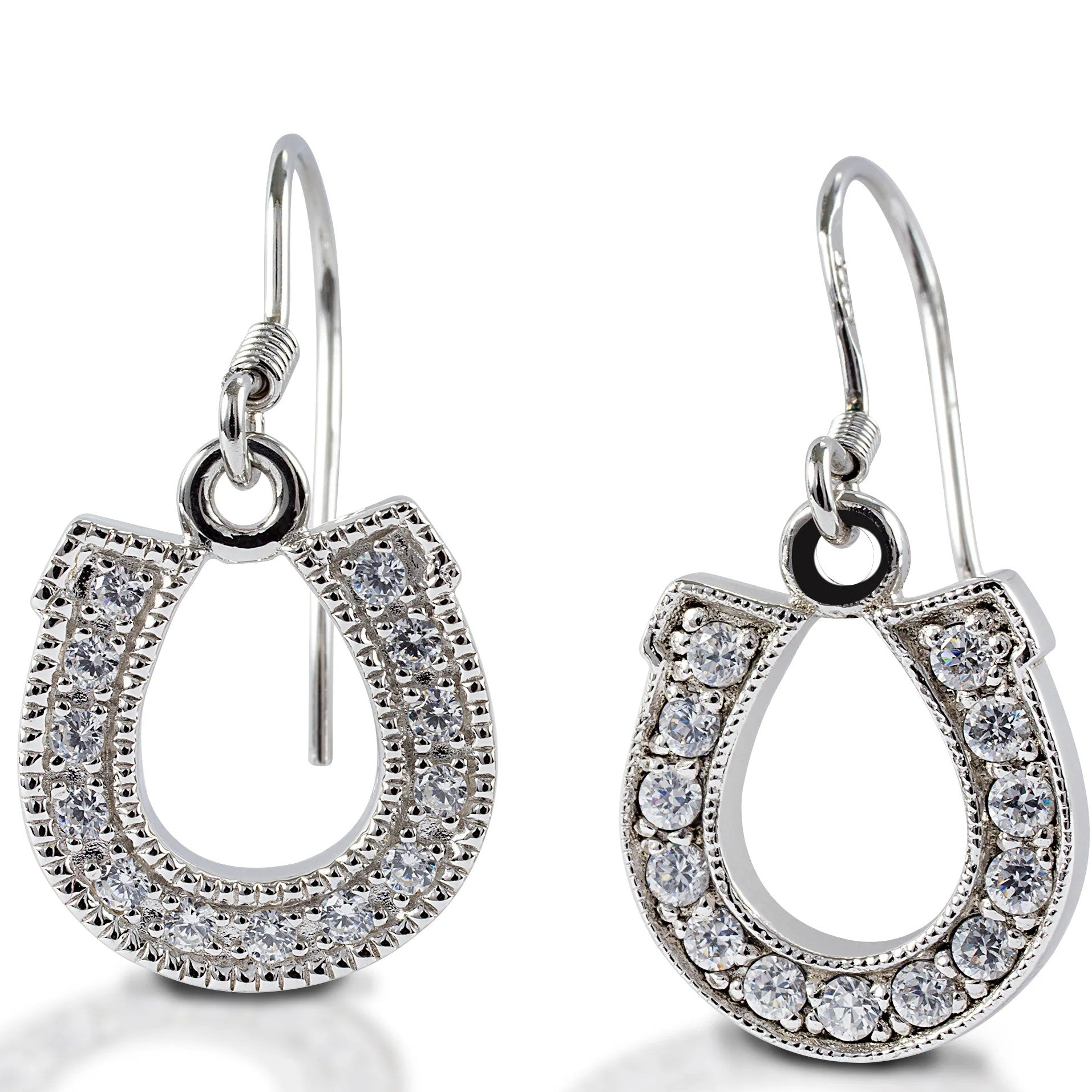 Kelly Herd Dangle Horseshoe Earrings feature horseshoe shaped drops on a hook style posts. Made in sterling silver with clear cubic zirconia stones.