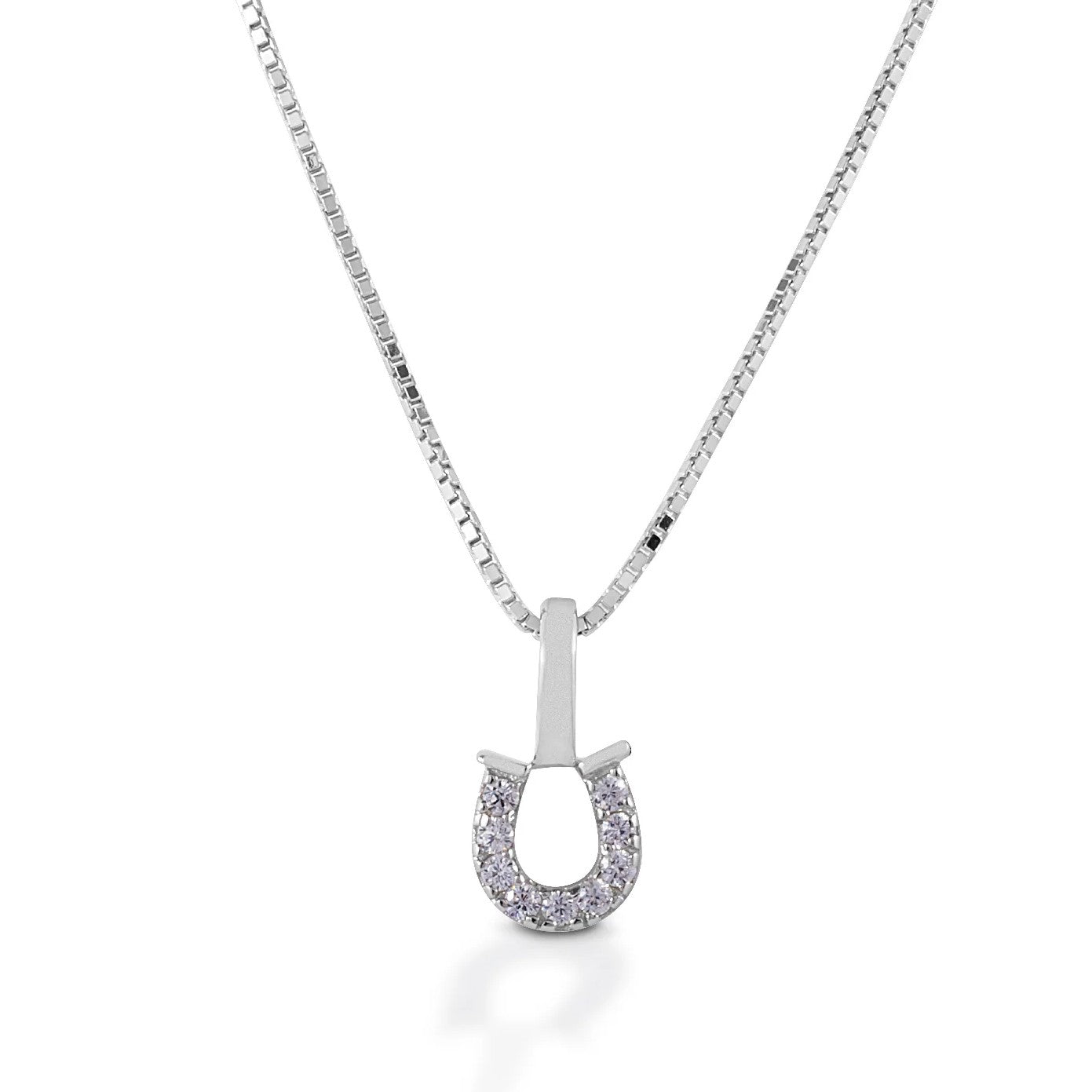 The Kelly Herd Clear Horseshoe Necklace features a delicate sterling silver pendant enhanced with clear CZ stones set in a horseshoe. Perfect for taking a little luck into the ring with you! Comes with 16-18" adjustable chain.