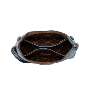 Elevate your everyday carry with this striking Wrangler wristlet, featuring bold embroidered Aztec patterns and playful fringe detailing. The rich blue hue adds versatility to any outfit, while the compact wristlet design keeps your essentials within reach. Perfect for nights out, festivals, or casual days when you want style without the bulk. Durable construction meets southwestern flair in this must-have accessory.