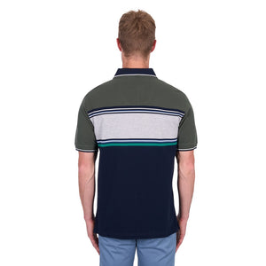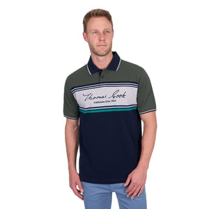 Experience refined style and comfort with the Thomas Cook Mens Polo Andy in Navy and Green. This tailored-fit polo features a multi-colour stripe design accented by ribbed collar and cuffs with contrast stripe tipping for a sharp look. Premium canvas taping along the front placket and contrast stripe taping on the inner neck add durability and subtle detailing. Side seam splits enhance movement, while contrasting buttons and thread complement the stripes. A large, embroidered chest logo completes the sophisticated finish, making it perfect for both casual outings and smart-casual occasions.
