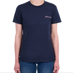 Classic navy tee made from durable 100% cotton jersey. Features a small chest print and striking back graphic, with a reinforced rib neck band for lasting comfort and fit.