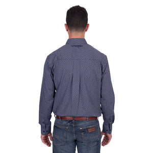 The Wrangler Men's Carl Shirt in Navy and Tan combines classic style with modern comfort. Crafted with stretch fabric, it allows easy movement throughout your day. Featuring a button-down collar, single chest pocket, and button closure, it delivers timeless versatility. Thoughtful details like a back yoke with a box pleat and contrast trim on the inside collar stand and cuffs enhance both comfort and style. Perfect for casual or smart-casual occasions, this shirt offers reliable fit and subtle design touches that stand out.